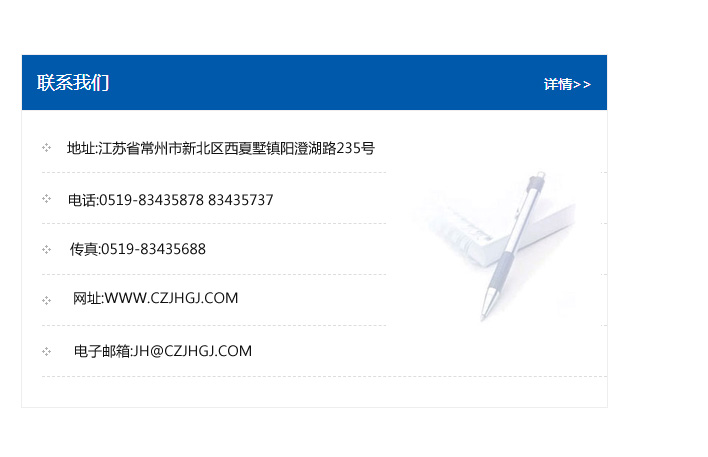 傳真:0519-83435688    郵編:213135    網址:WWW.czjhgj_com.tgelect.com    電子郵箱:JH@czjhgj_com.tgelect.com